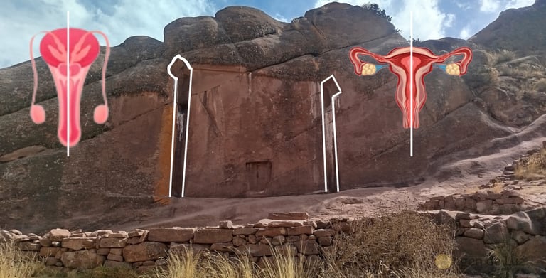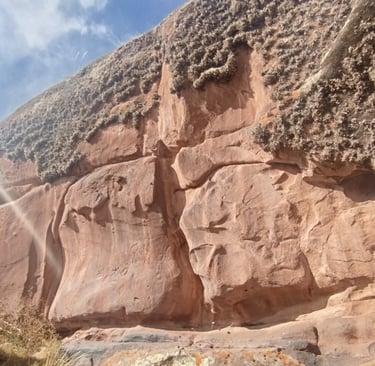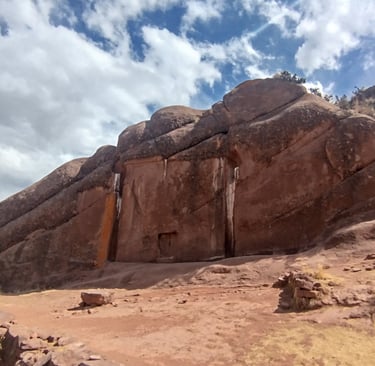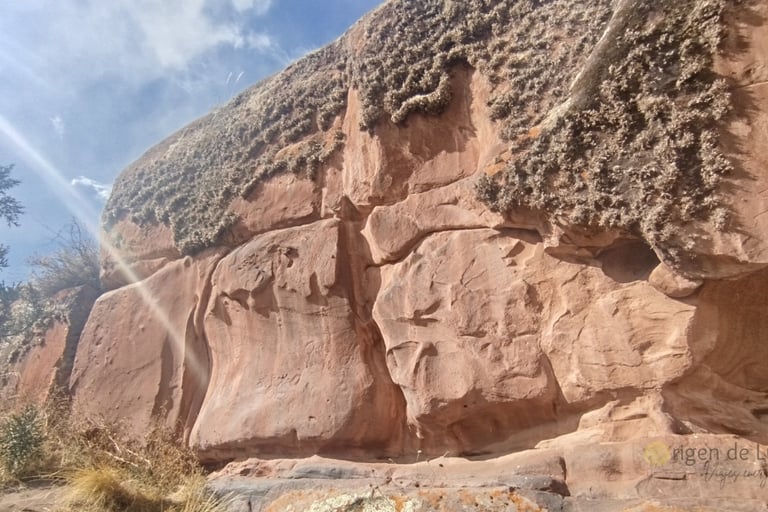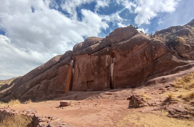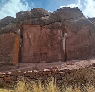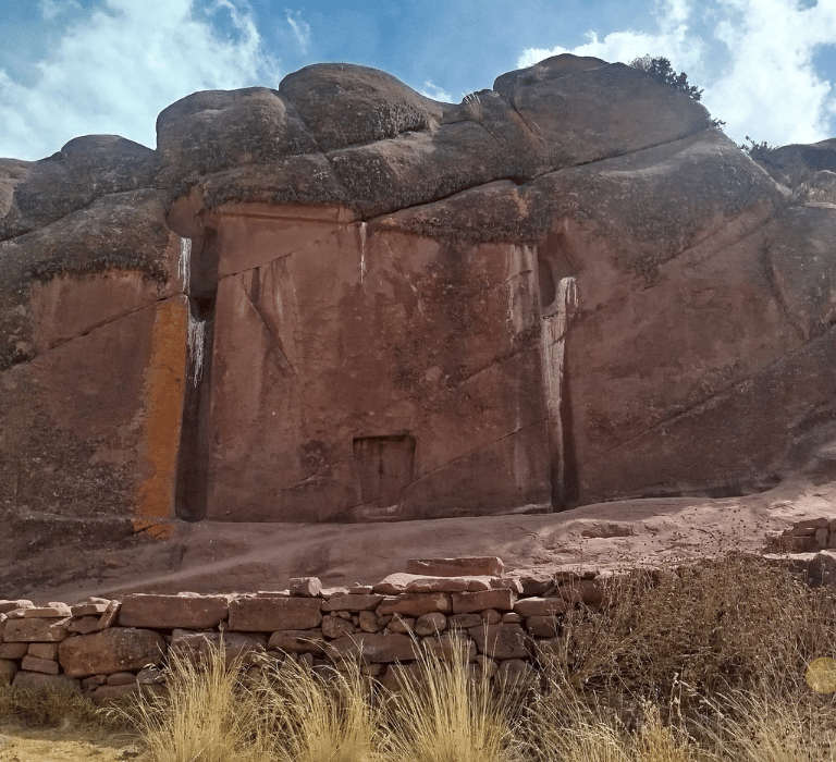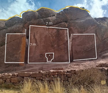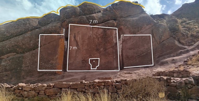Detrás del portal Aramu-Muru, puedes conseguir grabados de origen desconocido como este de la foto. En la foto de la izquierda lo puedes ver a los lejos y en la de la derecha ya puedes apreciarlo de cerca. ¿Qué significa? No lo sé, pero lo que sientes estando ahí es muy extraño, tomé la foto y me fui casi que corriendo del miedo que tenía.